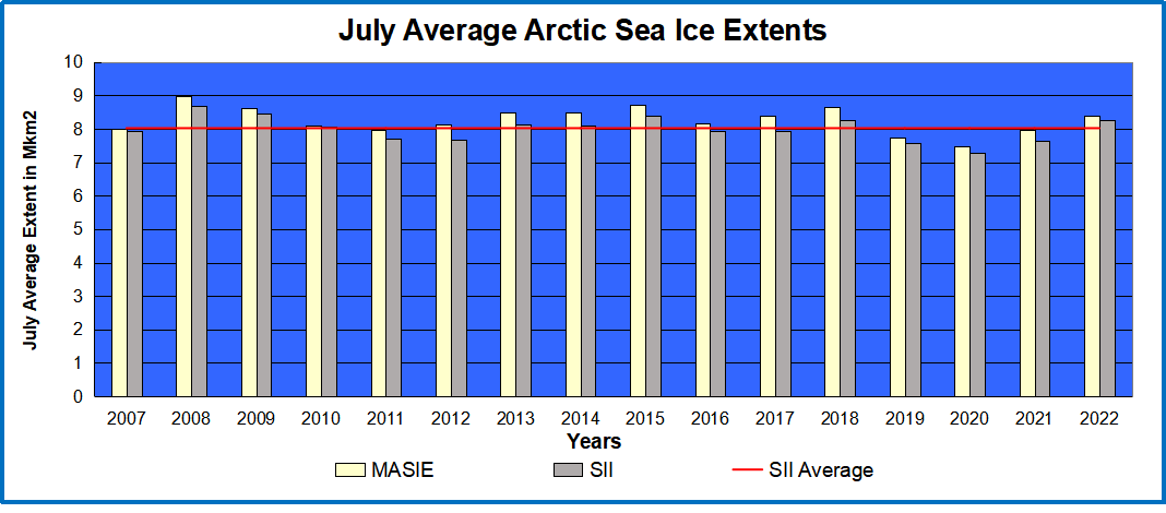 Clearly July ice appears as a plateau, and most years MASIE shows greater extents than SII, with differences of only a few 100k km2. The previous three years were in deficit to average, but July 2022 has returned to surplus years like 2018. More on MASIE dataset at the end.