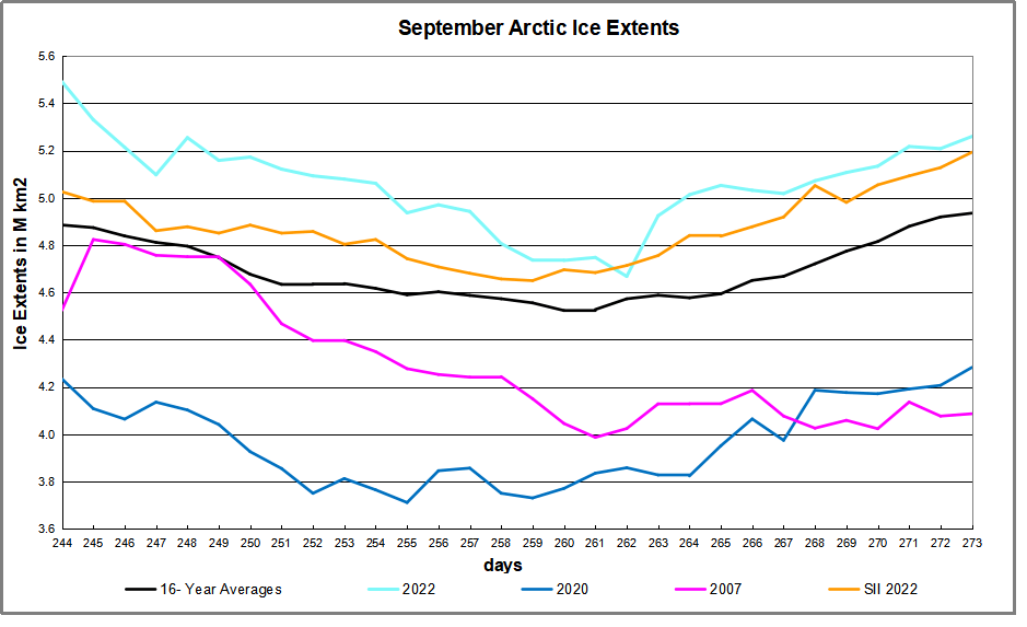 September daily extents are now fully reported and the 2022 September monthly results can be compared with those of the previous 15 years. MASIE showed 2022 at 5.1M km2 and SII was close behind, reaching 4.9M for the month. Analysis below shows that the 2022 Minimum was ~ 300k km2 higher than the 15 year average, and on day 273, this year was 1.2 Wadhams (1 M km2) more than 2007. The 16 yr. trendlines are virtually flat and matching the averages for the period.