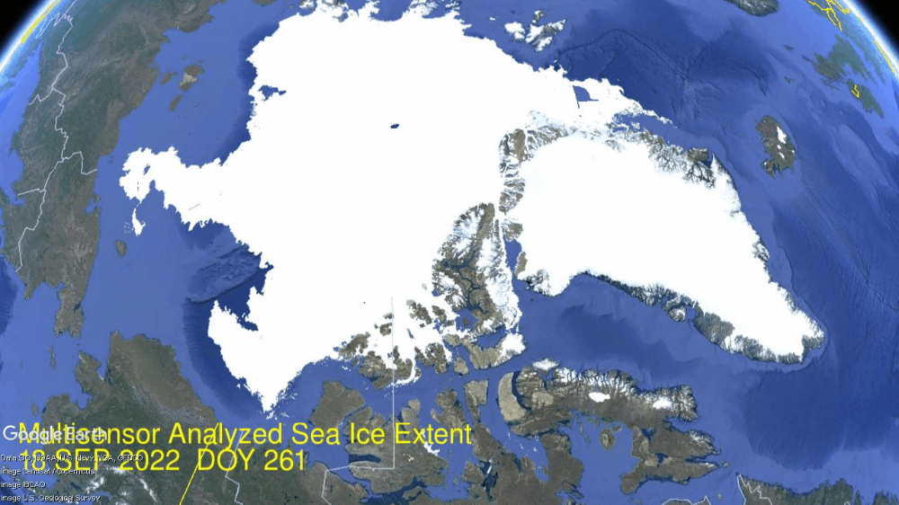 Note that MASIE was higher than average throughout September, with a brief minimum slightly after day 260, before increasing the surplus in the last half. SII tracked much lower before rising close to MASIE at the end. The other years, 2007 and 2020 were much lower than average. The animation below shows the ice extents for the last twelve days, depicting the ice recovery since day 261.