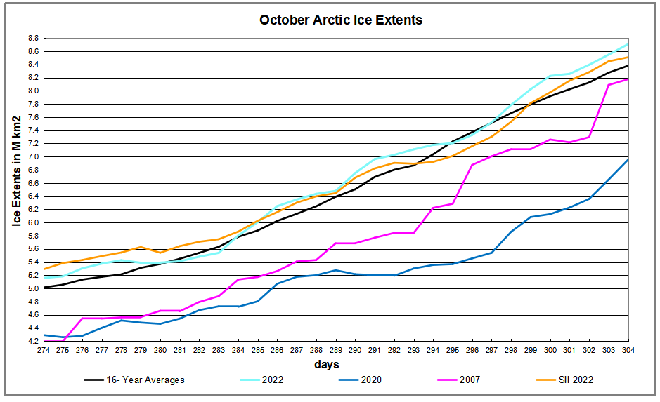 The black line shows during October on average Arctic ice extents increase ~3.4M km2 from ~5.0M km2 up to ~8.4M km2. The 2022 cyan MASIE line started the month 145k km2 above average and on day 304 increased its surplus to 327k km2. The Sea Ice Index in orange (SII from NOAA) tracked MASIE the entire month with slightly lower extents. 2007 started October with an 800k km2 deficit, but ended just 200k km2 below average. 2020 had the lowest extent in the record, ending October 1.76M km2 in deficit.