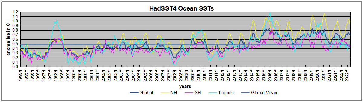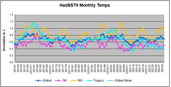 Note 2020 was warmed mainly by a spike in February in all regions, and secondarily by an October spike in NH alone. In 2021, SH and the Tropics both pulled the Global anomaly down to a new low in April. Then SH and Tropics upward spikes, along with NH warming brought Global temps to a peak in October. That warmth was gone as November 2021 ocean temps plummeted everywhere. After an upward bump 01/2022 temps reversed and plunged downward in June. After an upward spike in July, ocean air everywhere cooled in August and also in September. In October NH cooled, the Tropics changed little, and a spike in SH was enough to mildly warm the Global anomaly.