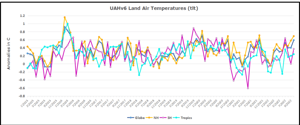 UAH has updated their tlt (temperatures in lower troposphere) dataset for October 2022. Posts on their reading of ocean air temps this month came after updated records from HadSST4. So I have already posted on SSTs using HadSST4 NH Leads Ocean Cooler October 2022. This month also has a separate graph of land air temps because the comparisons and contrasts are interesting as we contemplate possible cooling in coming months and years. Sometimes air temps over land diverge from ocean air changes. However, July showed air temps over all ocean regions warmed sharply, lifting up Global ocean temps. Then in August air over both land and ocean cooled off again. Now in September both land and ocean in SH dropped sharply offsetting slight warming elsewhere.