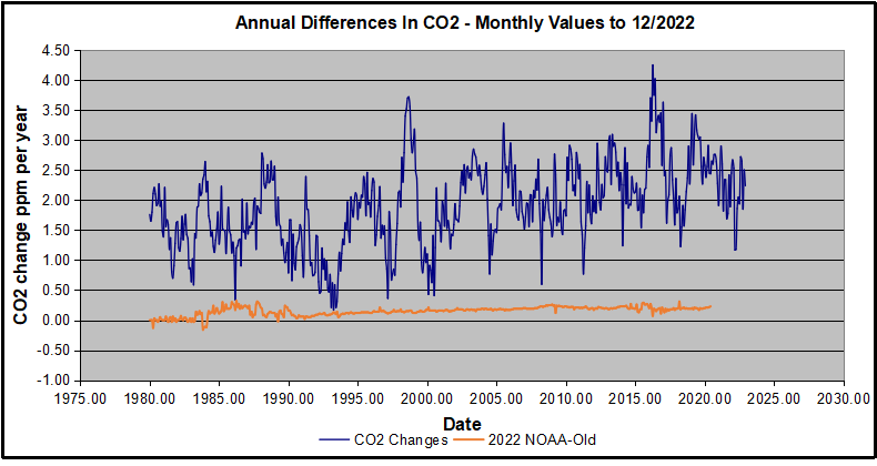 Now I find the NOAA dataset starting in 2021 has almost completely new values due to a method shift in February 2021, requiring a recalibration of all previous measurements.  The new picture of ΔCO2 is graphed below.