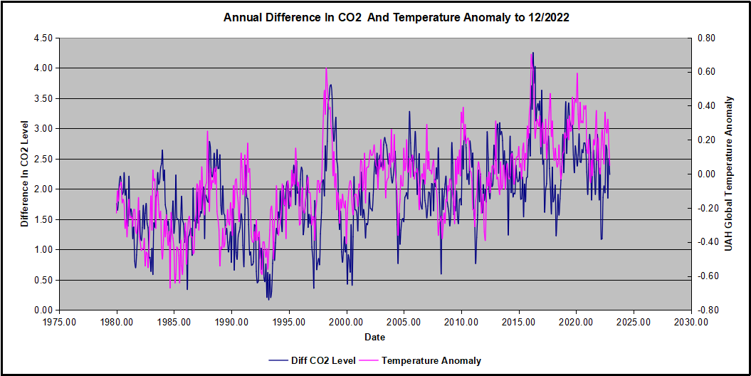 Here are UAH temperature anomalies compared to CO2 monthly changes year over year.