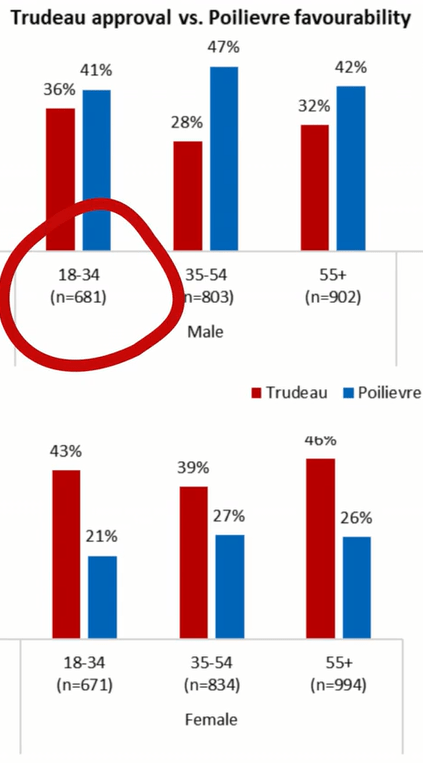 When you ask a man who’s their favorite prime minister, they answer by a wide margin:.this guy (Conservative Pierre Poilievre). When you ask women, the answer also by quite a large margin is: this guy (Liberal Justin Trudeau).