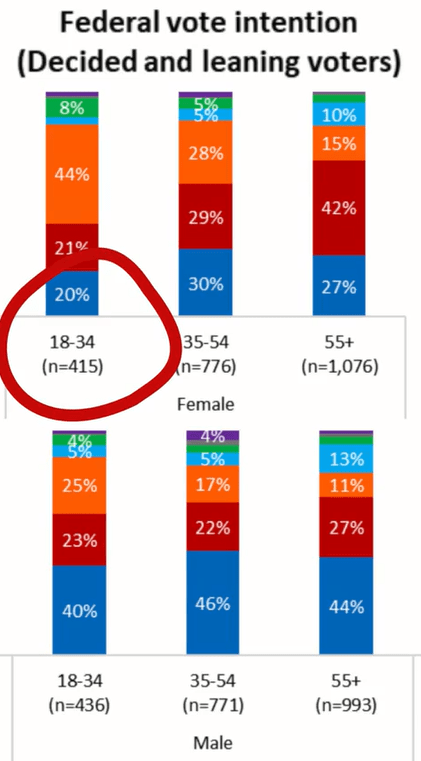 This chart from an Angus Reid Institute poll shows the voting intentions of men under age 35. That’s an huge showing for the conservatives, more than enough to give them a majority government, if only young men were voting. When you look at the under 35 women, they want a majority NDP governement with the Tories in third place.