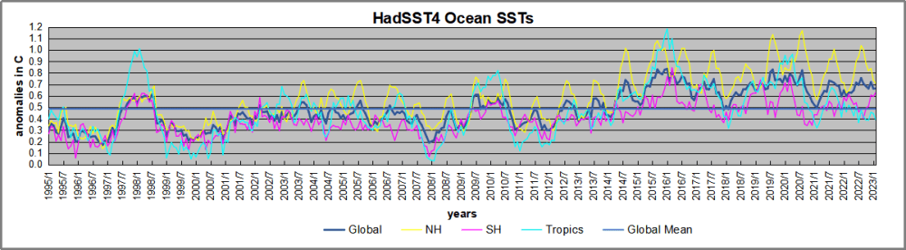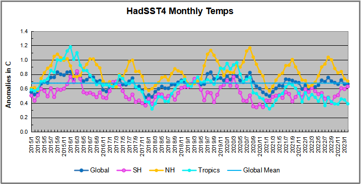 The chart below shows SST monthly anomalies as reported in HadSST4 starting in 2015 through February 2023. A global cooling pattern is seen clearly in the Tropics since its peak in 2016, joined by NH and SH cycling downward since 2016.