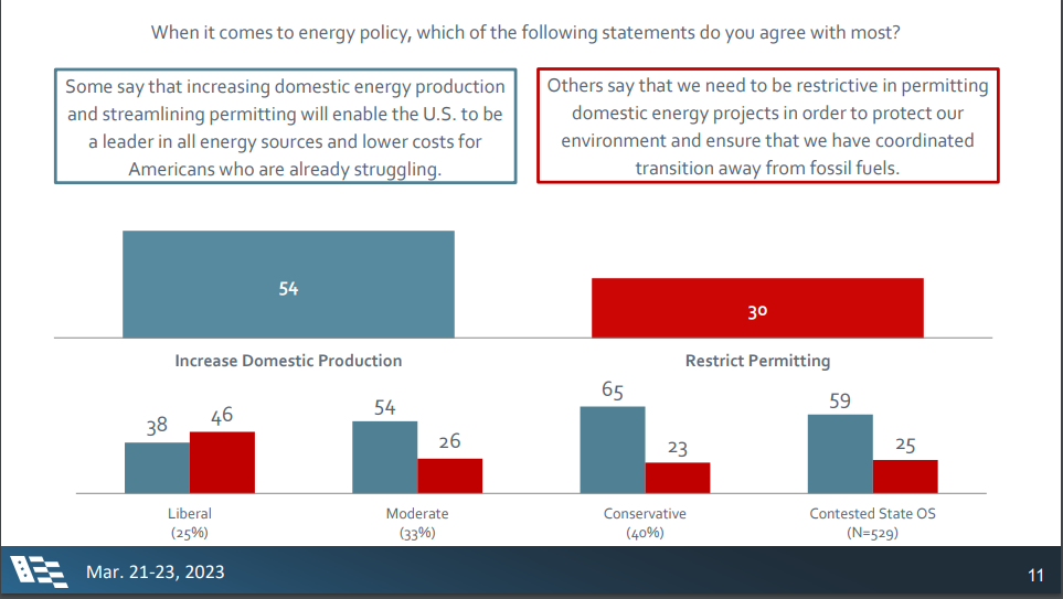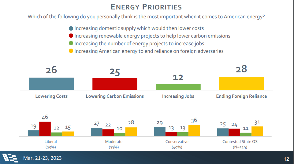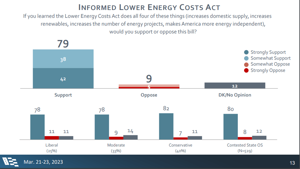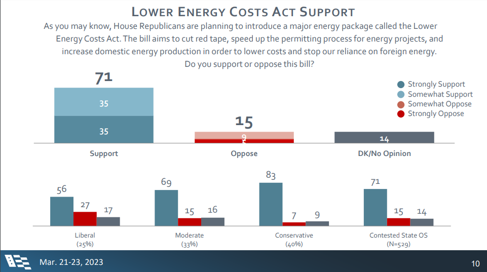 The poll was conducted by Senate Opportunity Fund, a not-for-profit 501(c)(4) organization, to test public opinion regarding congressional bill H.R.1, called The Lower Energy Costs Act. A national sample of 800 likely voters were contacted by phone during March 21 to 23, 2023, with questions regarding a number of public policy issues. Responses are shown by self-identified political leanings, and by participants located in battleground states. Note that the final question showed about 80% approval by all cohorts.