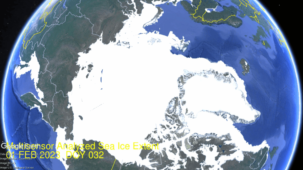 The graph (cyan) shows February 2023 starting with a 284k km2 deficit to average, several up and downs in the growth rate, until matching average at month end. 2020 also ended average with a steady refreezing rate. SII (Sea Ice Index) tracked well below MASIE this month showing 400k km2 lower extent than MASIE yesterday.