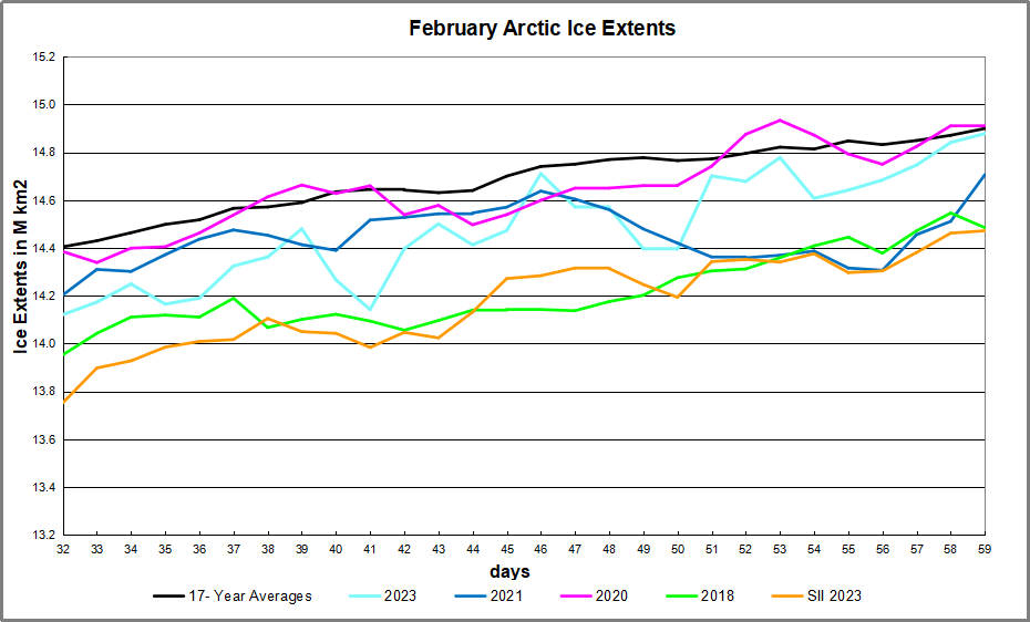 The month of February 2023 was remarkable for a wobbly Polar vortex, which cycles freezing polar air south, replacing it with incursions of warmer air into the Arctic, and then reverses the effect. This results in rising and falling freezing rates. The graph below shows the ice recovery for February 2023, the 17-year average and some recent years.