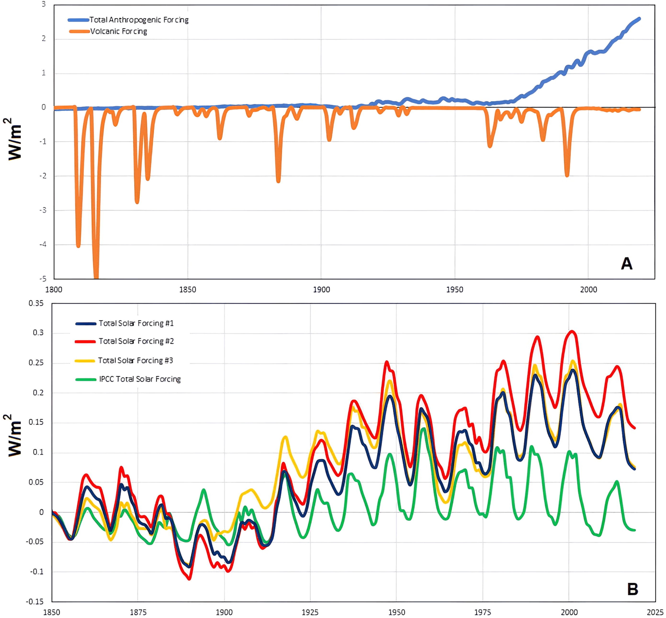Figure 5. (A) Anthropogenic (blue) and volcanic (orange) effective radiative forcing functions adopted by the CMIP6 GCMs (Masson-Delmotte et al., 2021). (B) Comparison between the solar effective radiative forcing function from Table Annex III of the IPCC-AR6 (green) (after Masson-Delmotte et al., 2021) and the three TSI forcing functions deduced from the TSI records shown in Fig. 4. All records are anomalies relative to their values in 1850.