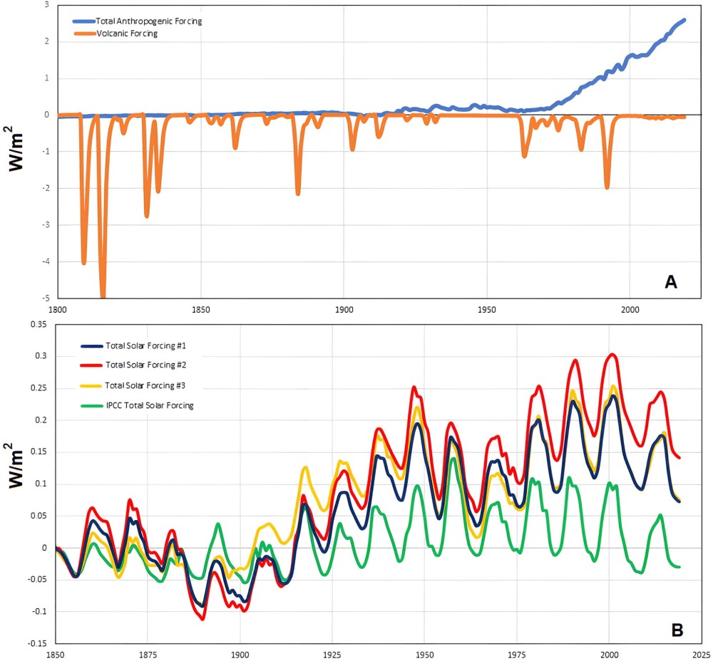 However, the IPCC’s conclusions are based solely on computer simulations made with global climate models (GCMs) forced with a total solar irradiance (TSI) record showing a low multi-decadal and secular variability. The same models also assume that the Sun affects the climate system only through radiative forcing – such as TSI – even though the climate could also be affected by other solar processes.