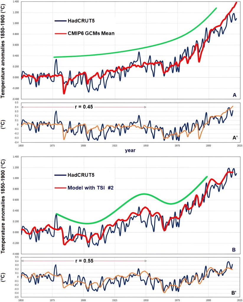 Figure 8. (A) HadCRUT5 global surface temperature versus the CMIP6 GCM ensemble average; (A’) the two records are detrended with the function f(t) = a (x-1850)2. (B) HadCRUT5 global surface temperature versus the energy balance model (Eq. (16)) using the TSI proxy model #2; (B’) the same as above. The green curves in Fig. 8A and B are sketches that highlight the different multi-decadal modulation of the red curves in Fig. 8A (monotonically increasing, like the anthropogenic forcing function) and in Fig. 8B (oscillating, like the temperature records).