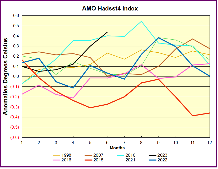 The HadSST4 AMO dataset was finally updated and showed dramatic 2023 warming in the North Atlantic. Let’s consider two possibilities.