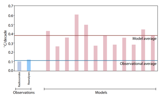 Figure 8: Warming in the tropical troposphere according to the CMIP6 models. Trends 1979–2014 (except the rightmost model, which is to 2007), for 20°N–20°S, 300–200 hPa.
