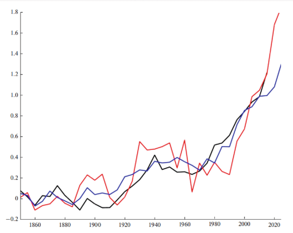 We now consider the simulation of climate changes for 1850–2021. The 5-year mean surface temperature from HadCRUT5 (black), INMCM48 (blue), and INMCM60 (red) is shown in Fig. 3. The average for the period 1850 to 1899 is subtracted for each of the three datasets. The model data are slightly extended to the future, so that the most recent value matches the 2025–2029 average. It can be seen that warming in both versions by 2010 is about 1 K, approximately consistent with observations. The observed climate changes, such as the warmer 1940s and 1950s and the slower warming, or even a small cooling, in the 1960s and 1970s, are also obtained in both model versions. However, the warming after 2010–2014 turns out to be far larger in the new version than in the previous one, with differences reaching 0.5 K in 2025–2029. The discrepancies between the two versions are most distinct in the rate of temperature rise from 1990–1994 to 2025–2029. In INMCM48, the temperature rises by about 0.8 K, while the increase for INMCM60 is about 1.5 K. The discrepancy appears to have been caused primarily by a different sensitivity of the models, but a substantial contribution may also come from natural variability, so a more reliable conclusion could be made only by running ensemble numerical experiments.