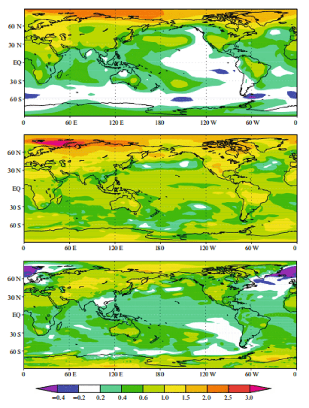 Figure 4 displays the difference in surface air temperature from HadCRUT5 (top), the new version (midddle) , and the previous version (bottom) in 2000–2021 and 1979–1999. It is the interval where the warming was the largest, as is seen in Fig. 3. The observational data show that the largest warming, above 2 K, was in the Arctic, there was a warming of about 1 K in the Northern Hemisphere midlatitudes, and there was hardly any warming over the Southern Ocean. The pattern associated with a transition of the Pacific Decadal Oscillation (PDO) from the positive phase to the negative one appears over the Pacific Ocean. The new model version simulates a temperature rise at high and middle northern latitudes more closely to observations, whereas the previous version underestimates the rise in temperature in that region.