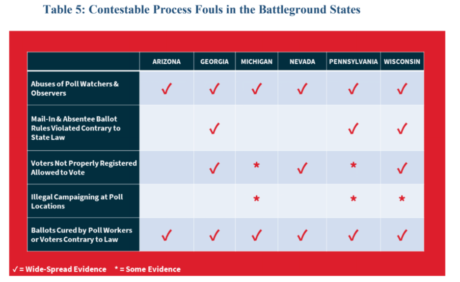 There is extensive evidence that the US 2020 election did not respect the above best practices. The 2021 Navarro Report (link in red above) provides the details summarized in this table: