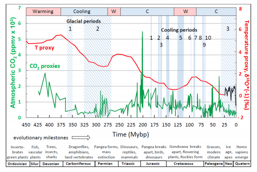 Figure 16. The geological history of CO2 level and temperature proxy for the past 400 million years. CO2 levels now are ~ 400ppm