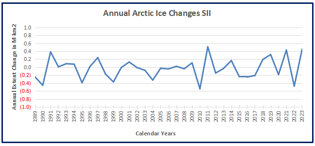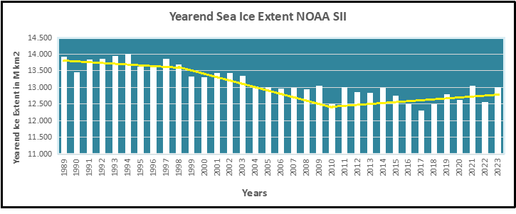 Year-end Arctic ice extents (last 5 days of December) show three distinct regimes: 1988-1998, 1998-2010, 2010-2022. The average year-end extent 1989-2010 is 13.4M km2. In the last decade, 2011 was 13.0M km2, and six years later, 2017 was 12.3M km2. 2021 rose back to 13.06 2022 slipped back to 12.6M, and 2023 is back up to 13.0M. So for all the the fluctuations, the net is zero, or a gain of half a Wadham (0.5M) from 2010. Talk of an Arctic ice death spiral is fanciful.