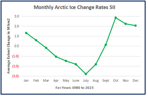 Note that the +/ – rate anomalies are distributed all across the grid, sequences of different months in different years, with gains and losses offsetting one another. As noted earlier, in 2023 the outlier negative months were June through September where unusual amounts of ice were lost. Then unusally strong gains in October and December resulted in a large annual gain, compared to the baseline. The bottom line presents the average anomalies for each month over the period 1979-2021. Note the rates of gains and losses mostly offset, and the average of all months in the bottom right cell is virtually zero.