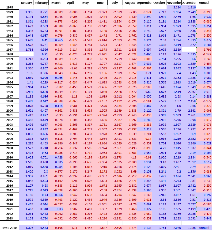 The values in January show changes from the end of the previous December, and by summing twelve consecutive months we can calculate an annual rate of change for the years 1979 to 2023.