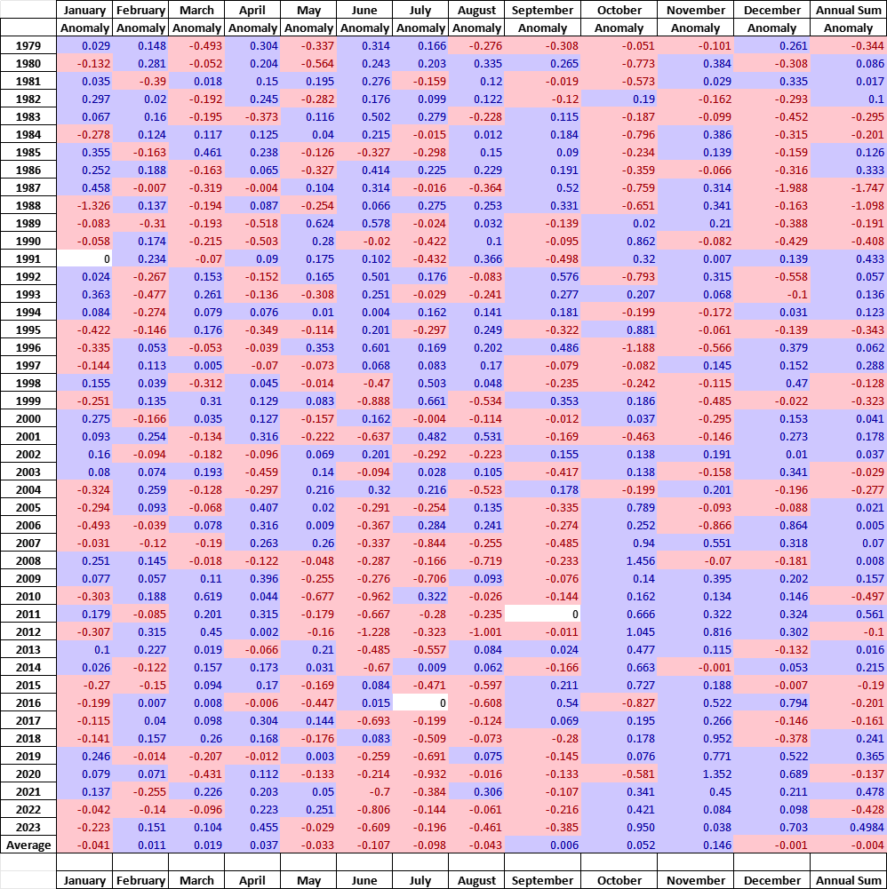 As it happens in this dataset, October has the highest rate of adding ice. The table below shows the variety of monthly rates in the record as anomalies from the 1980-2010 baseline. In this exhibit a red cell is a negative anomaly (less than baseline for that month) and blue is positive (higher than baseline).
