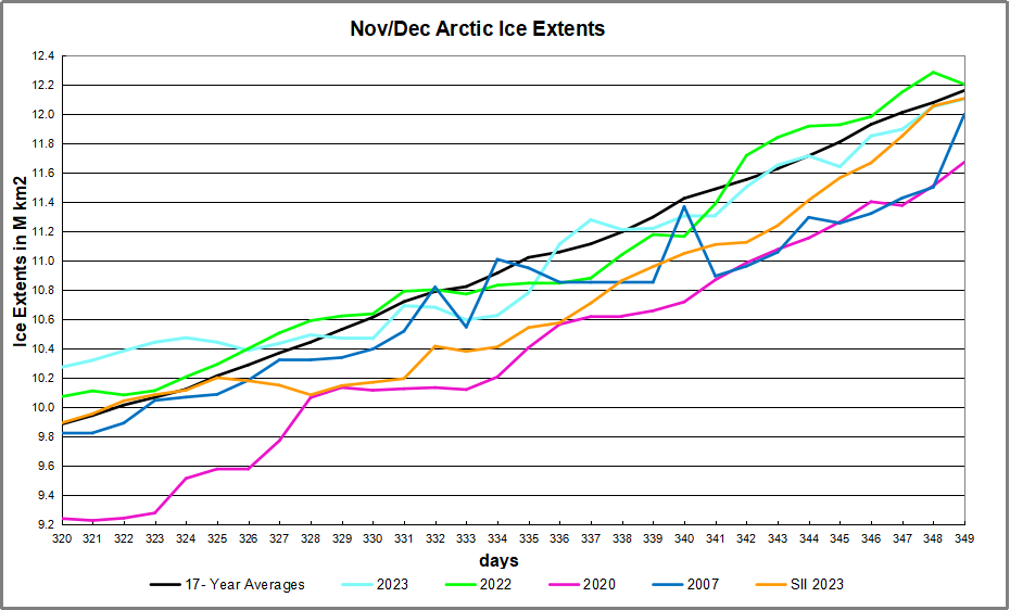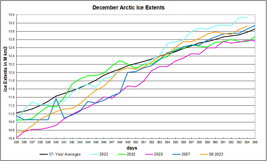 Note the average year adds 2M km2 while 2023 added ~2.5M, now 361k km2 above average. SII started 200k km2 lower than MASIE and ended up with the same deficit. Note that the other years are not far from the 17-year average at year end.