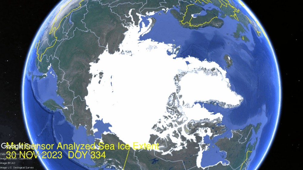 The month of December 2023 shows Hudson Bay (lower right) starting with some western shore ice and ending 92% ice covered, adding in that basin ~800k km2. Just above Hudson, you can see the Gulf of St. Lawrence icing over, and Baffin Bay adding ice as well, now up to 50% of its annual maximum.
