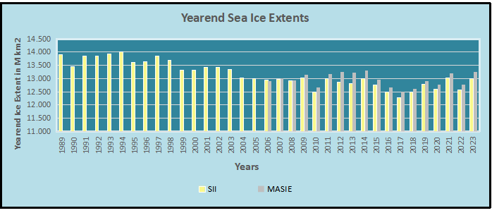 At the bottom is a discussion of statistics on year-end Arctic Sea Ice extents. The values are averages of the last five days of each year. End of December is a neutral point in the melting-freezing cycle, midway between September minimum and March maximum extents.