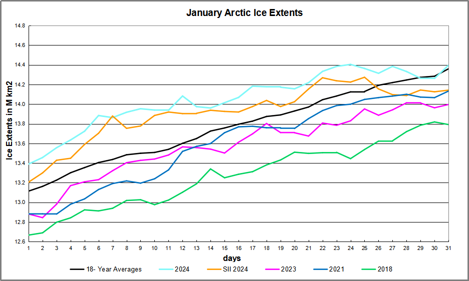 The graph shows the 18-year average gain for January is 1.2M km2. 2024 started with 275k km2 surplus ice extent and ended slightly above average, while and other recent years were lower. SII showed lower extents most of the month with a 253k km2 deficit to MASIE at the end.