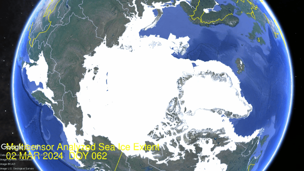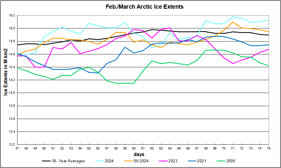 The table below shows the distribution of Sea Ice on day 75 across the Arctic Regions, on average, this year and 2006.