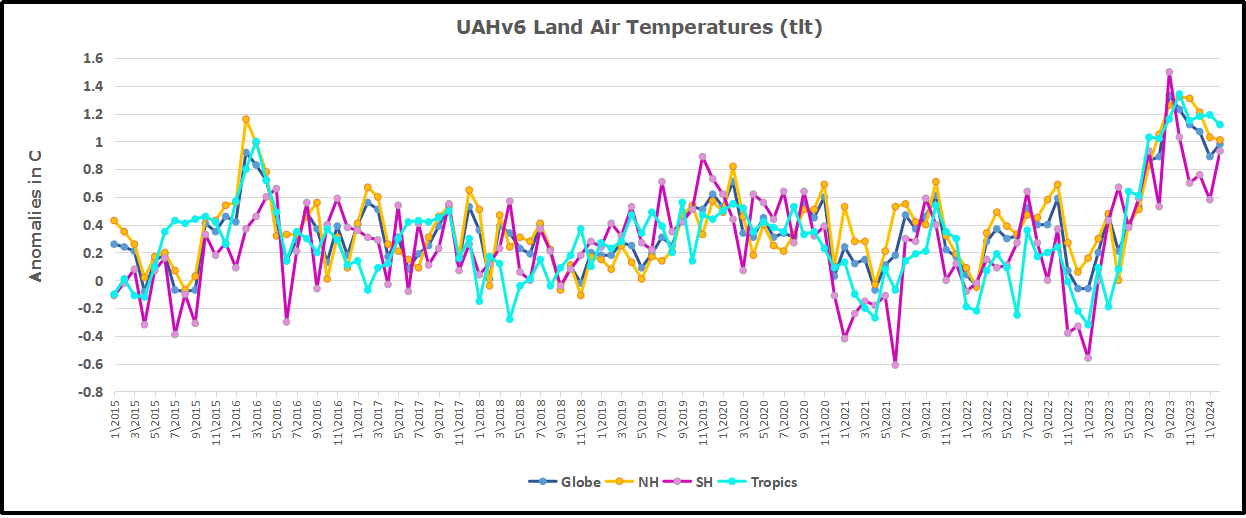 Figure 13: Zonal air temperatures. Global monthly average lower troposphere temperature since 1979 for the tropics and the northern and southern extratropics, according to University of Alabama at Huntsville, USA. Thin lines: monthly value; thick lines: 3-year running mean.