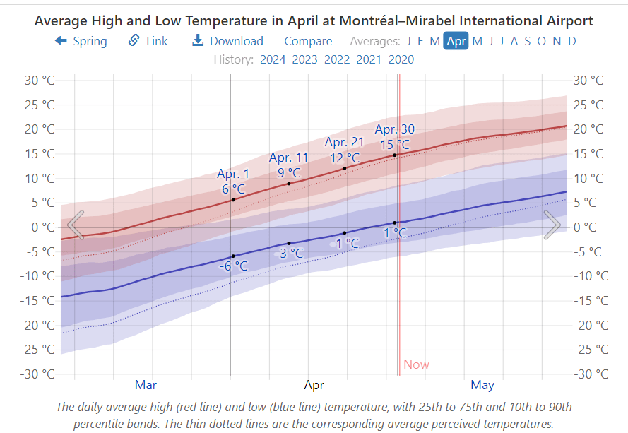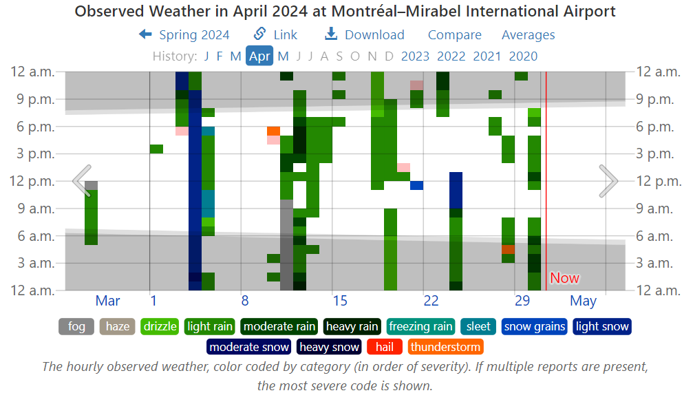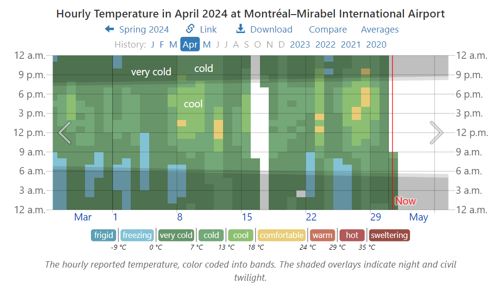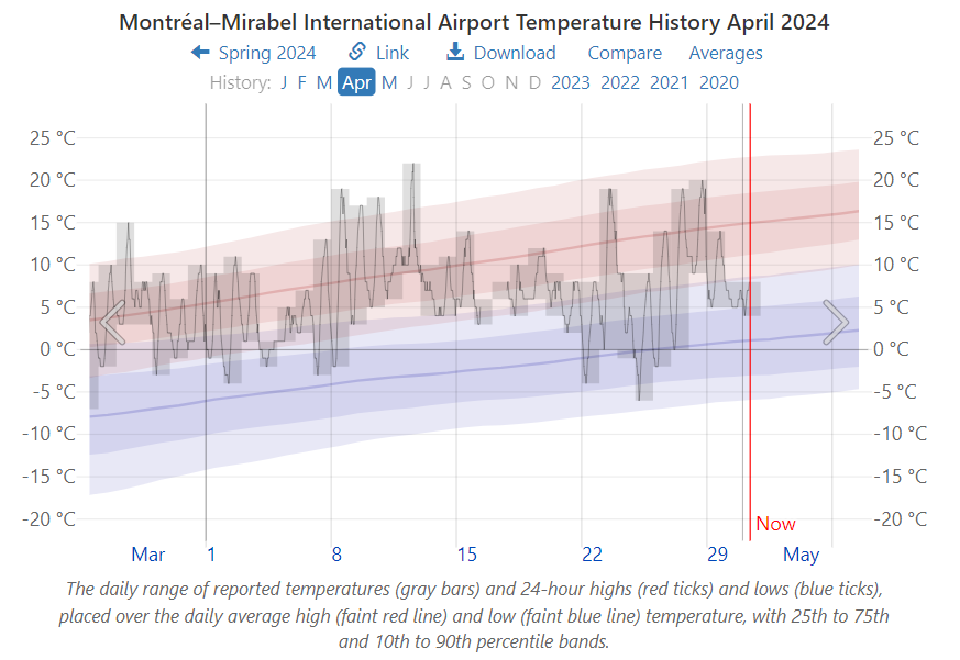 For sure you’ve seen the headlines declaring 2024 likely to be the Hottest year ever. If you’re like me, your response is: That’s not the way it’s going down where I live. Fortunately there is a website that allows anyone to check their personal experience with the weather station data nearby. weatherspark.com provides data summaries for you to judge what’s going on in weather history where you live. In my case a modern weather station is a few miles away April 2024 Weather History at Montréal–Mirabel International Airport. The story about April 2024 is evident below in charts and graphs from this site. There’s a map that allows you to find your locale.