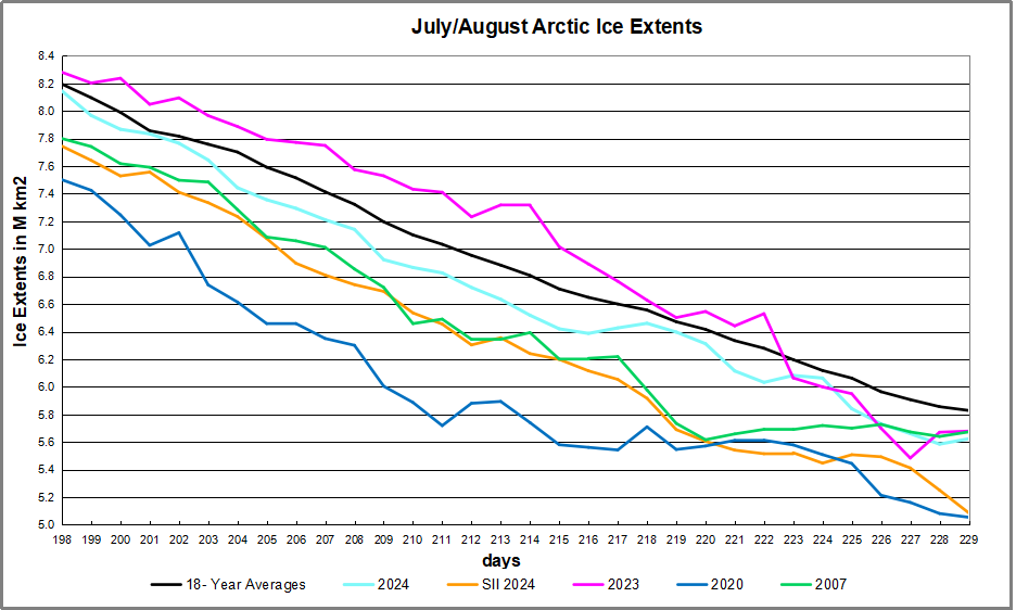 The table below shows the distribution of Sea Ice on day 229 across the Arctic Regions, on average, this year and 2007. At this point in the year, Bering and Okhotsk seas are open water and thus dropped from the table.