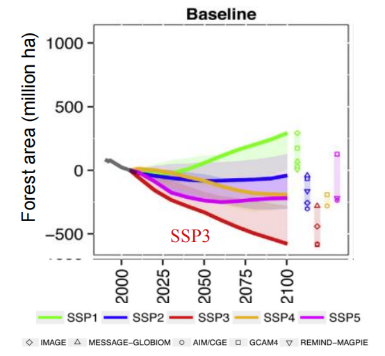 • Decreases in forest area were also substantial in SSP3- 7.0, unlike in the other SSP-RCPs.