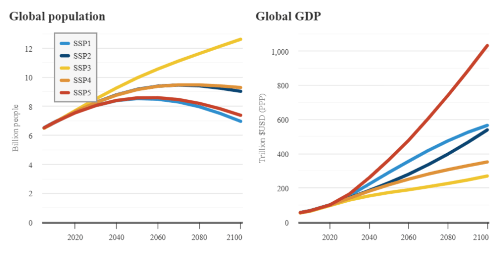Global population (left) in billions and global gross domestic product (right) in trillion US dollars on a purchasing power parity (PPP) basis. Data from the SSP database; chart by Carbon Brief using Highcharts.