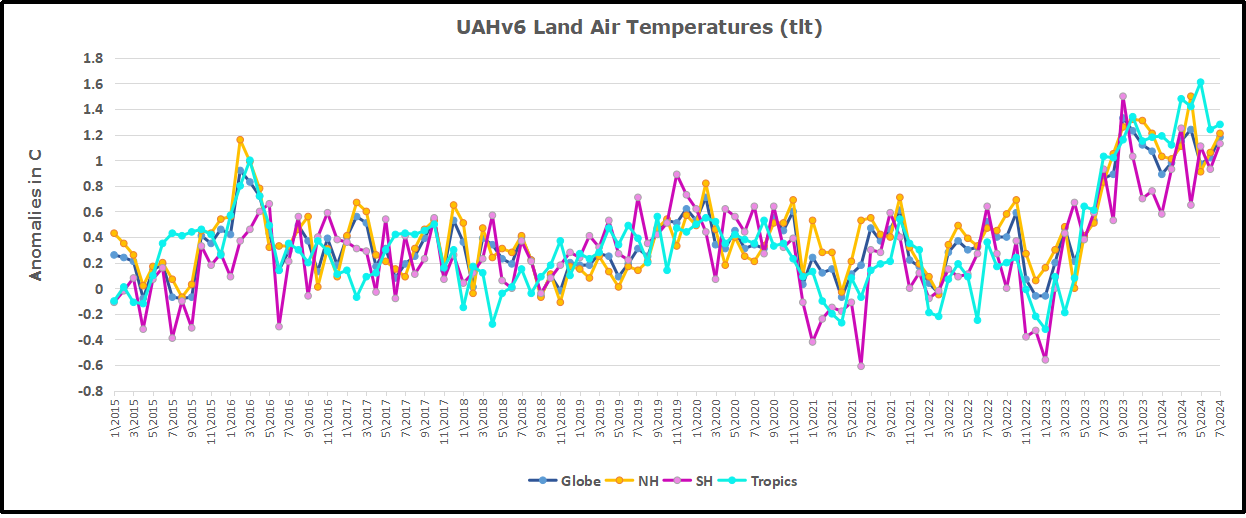 So both versions of the model replicate well the observed history. And when fed the SSP3-7.0 inputs, both project a warmer, wetter world out to 2100; INMCM5 reaches 4.5C and INMCM6 gets to 6.0C. The scenario achieves the desired high warming, and the cloud enhancements in version 6 amplify it. I would like to see a similar experiment done with the actual medium scenario SSP2-4.5.