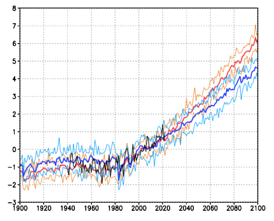 Fig. 1 Annual near surface air temperature change in Northern Eurasia with respect to 1995–2014 for INMCM6 (red), INMCM5 (blue) and ERA5 reanalysis (Hersbach et al, 2020)(black), K. Orange and lightblue lines show ensemble spread.