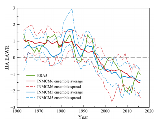 Fig. 5 Time series of June-July-August 5-year mean East Atlantic/ West Russia (EAWR) index. Maximum and minimum of the model ensemble are shown as a dashed lines. INMCM6 and INMCM5 ensemble averaged indices are plotted as a red and blue solid lines, respectively. The ERA5 (Hersbach et al, 2020) EAWR index is shown in green.