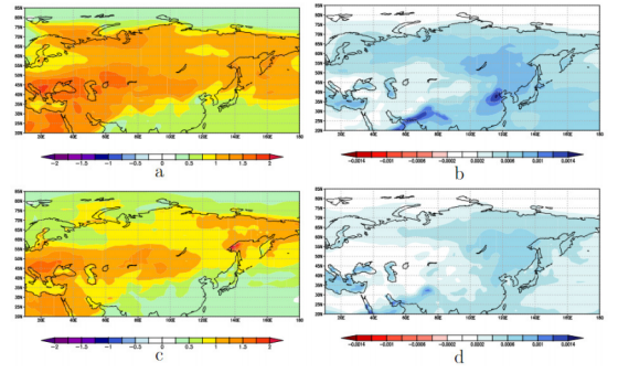In this study, East Atlantic/ West Russia (EAWR) index was calculated as the projection coefficient of monthly 500 hPa geopotential height anomalies to the second EOF of monthly reanalysis 500 hPa geopotential height anomalies over the region 20N–80N, 60W–140E.