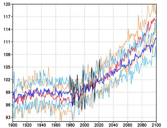 Fig. 7 Annual precipitation change (% with respect to 1995–2014) in Northern Eurasia for INMCM6 (red), INMCM5 (blue) and GPCP analysis (Adler et al, 2018) (black). Orange and lightblue lines show ensemble spread.