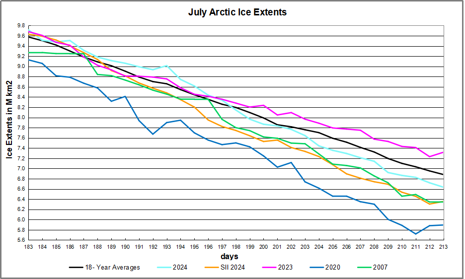 The table below shows the distribution of Sea Ice on day 213 across the Arctic Regions, on average, this year and 2007. At this point in the year, Bering and Okhotsk seas are open water and thus dropped from the table.