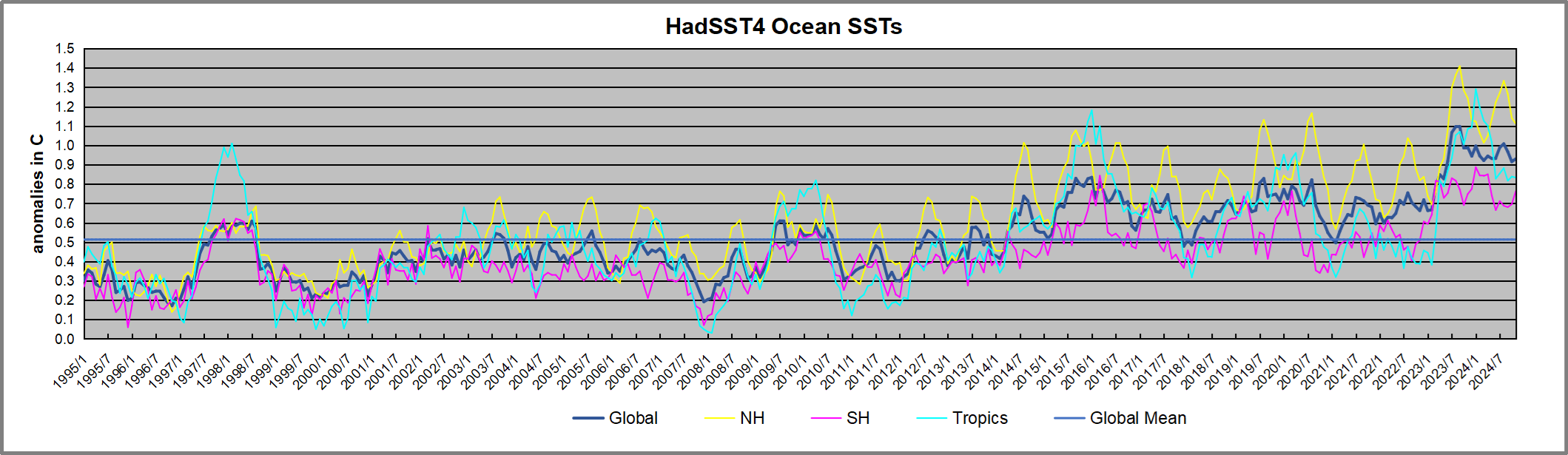 TLTs include mixing above the oceans and probably some influence from nearby more volatile land temps. Clearly NH and Global land temps have been dropping in a seesaw pattern, nearly 1C lower than the 2016 peak. Since the ocean has 1000 times the heat capacity as the atmosphere, that cooling is a significant driving force. TLT measures started the recent cooling later than SSTs from HadSST4, but are now showing the same pattern. Despite the three El Ninos, their warming had not persisted prior to 2023, and without them it would probably have cooled since 1995. Of course, the future has not yet been written.