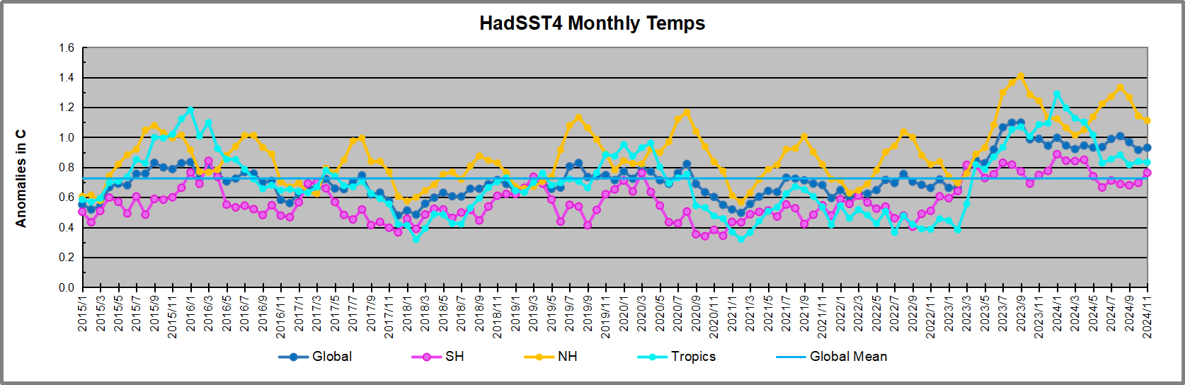 After sharp cooling everywhere in January 2023, there was a remarkable spiking of Tropical ocean temps from -0.5C up to + 1.2C in January 2024. The rise was matched by other regions in 2024, such that the Global anomaly peaked at 0.95C in May, Since then the Tropics and the Global anomaly have cooled down to 0.5C, as well as SH dropping down to 0.4C in December.