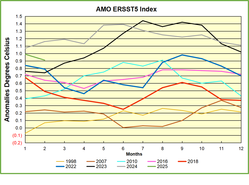 Then in 2024 the AMO anomaly started higher than any previous year, then leveled off for two months declining slightly into April. Remarkably, May showed an upward leap putting this on a higher track than 2023, and rising slightly higher in June. In July, August and September 2024 the anomaly declined, and despite a small rise in October, ended close to where it began. Now 2025 is starting lower than the previous year.