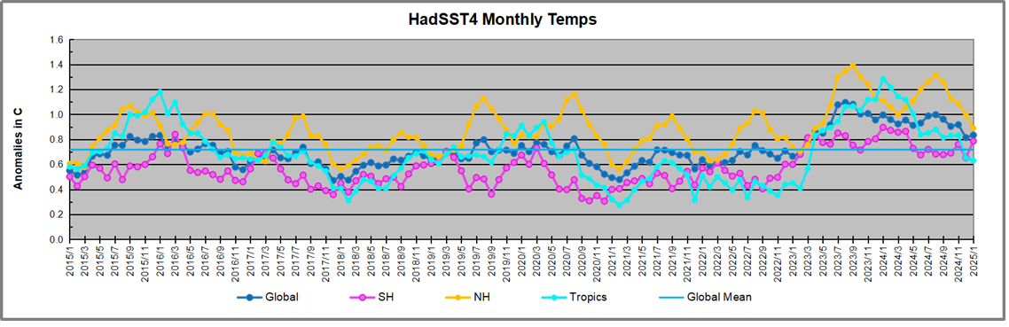 The chart below shows SST monthly anomalies as reported in HadSST3 starting in 2015 through January 2025. A global cooling pattern is seen clearly in the Tropics since its peak in 2016, joined by NH and SH cycling downward since 2016, followed by rising temperatures in 2023 and 2024.