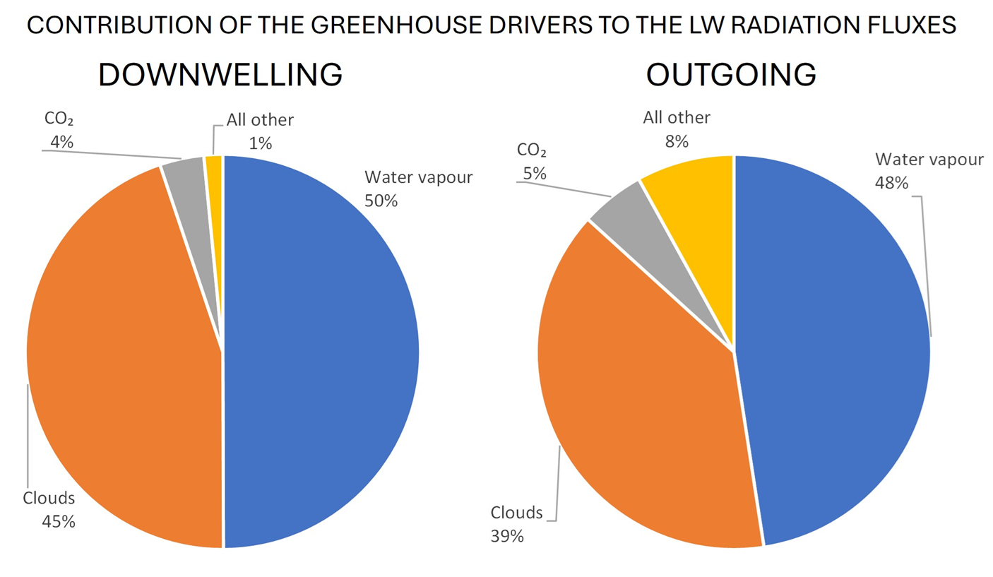 The results show that the contribution of CO₂ is 4% – 5%, while water and clouds dominate with a contribution of 87% – 95%. The minor effect of carbon dioxide is confirmed by the small, non-discernible effect of the recent escalation of atmospheric CO₂ concentration from 300 to 420 ppm. This effect is quantified at 0.5% for both downwelling and outgoing radiation. Water and clouds also perform other important functions in climate, such as regulating heat storage and albedo, as well as cooling the Earth’s surface through latent heat transfer, contributing 50%. By confirming the major role of water on climate, these results suggest that hydrology should have a more prominent and more active role in climate research.
