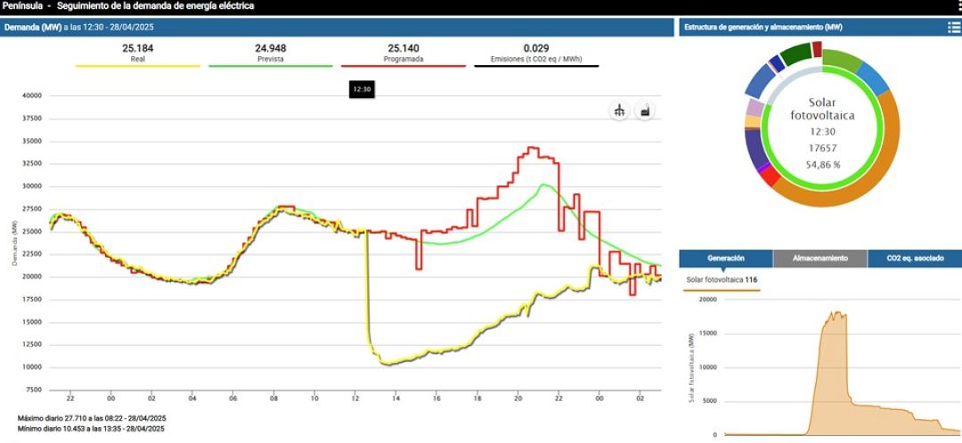 TSO data shows the point just after 12:30 on Monday 28 April when Spain’s electricity grid collapsed. When the collapse occurred, the Spanish electrical grid had almost 80% renewable generation, 11% nuclear, and only 3% natural gas. There was practically no base generation or physical inertia to absorb the shock that was generated. Source: Red Eléctrica