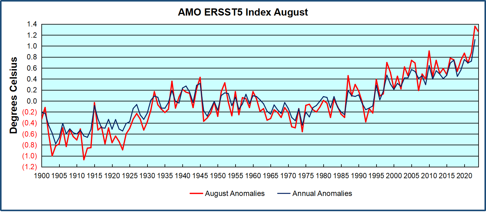 The chart above confirms what Kaplan also showed. As August is the hottest month for the N. Atlantic, its variability, high and low, drives the annual results for this basin. Note also the peaks in 2010, lows after 2014, and a rise in 2021. Then in 2023 the peak was holding at 1.4C before declining. An annual chart below is informative: